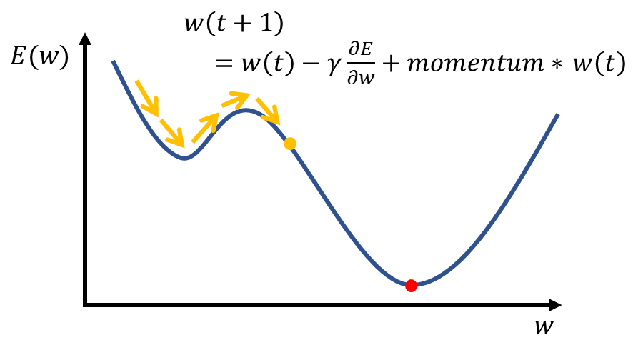 이를 완화하기 위해 모멘텀을 사용합니다. 모멘텀은 번역하면 운동량이라는 뜻으로, 마치 산에서 굴러 떨어진 돌이 가속에 의하여 작은 언덕을 넘어가듯이 지역 최솟값을 넘어 전역 최솟값을 찾는데에 도움이 됩니다.