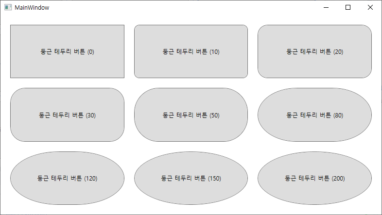 <Button Grid.Column="2" Grid.Row="2" Content="둥근 테두리 버튼 (200)" Margin="10">