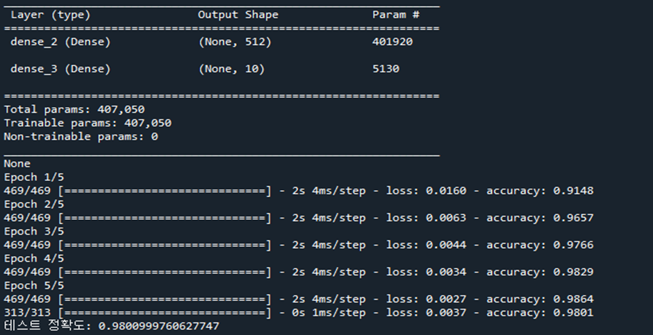 테스트 정확도: 0.9804999828338623