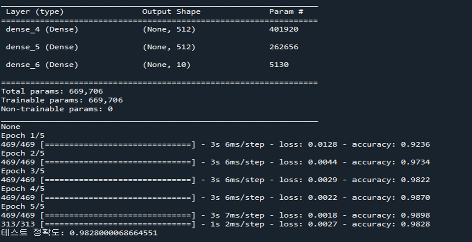 #model.add(tf.keras.layers.Dense(512, activation='relu')) # 은닉층2
