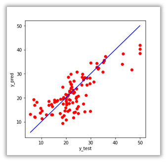 은닉층 유닛에 렐루 활성화 함수를 사용해 구현하였습니다. 정답은 x축으로 예측값은 y축으로 두어 예측값 점분포도를 그린 결과는 오른쪽과 같습니다. 기준선인 파란색 선에 가까울수록 정확하게 예측한 것으로 어느정도 회귀가 학습된 것을 확인할 수 있습니다.