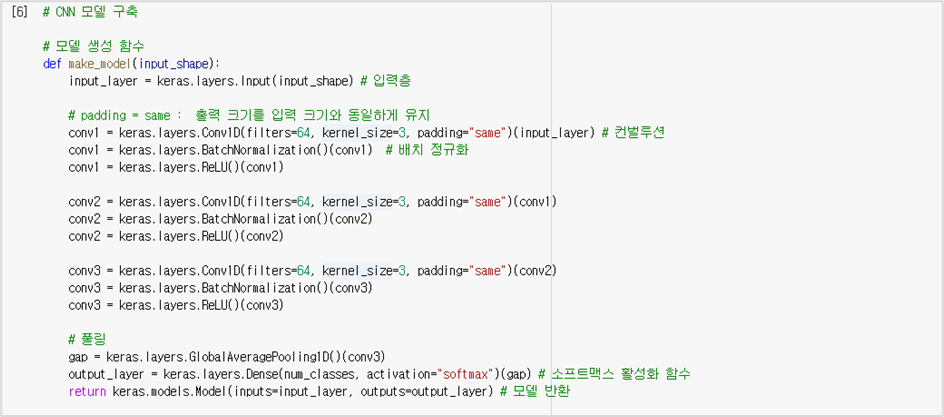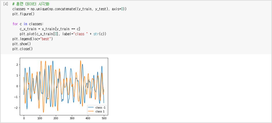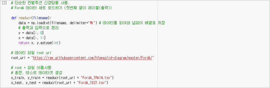 9. FordA 데이터 세트를 이용하여 시계열 데이터를 분류해보자. FordA 데이터 세트에는 3601개의 훈련 샘플과 1320개의 테스트 샘플이 들어있다. 이들 시계열 데이터는 자동차 엔진 센서가 포착한 엔진 소음 측정 값이다. 이 작업의 목표는 엔진에 특정 문제가 있는 자동으로 감지하는 것이다. 이것은 이진 분류 작업으로 볼 수 있다. 시계열 데이터도 단순한 컨벌루션 신경망을 사용하여 분류할 수도 있다. https://keras.io./examples/timeseries/를 참조한다.