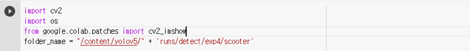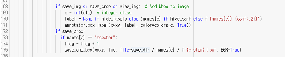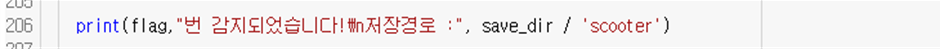 학습한 모델을 이용해 전동 킥보드 탑승자를 가려낼수 있었으며 –save-crop 옵션으로 인식된 객체의 이미지를 폴더에 저장할 수 있었다. 이어서 detect.py를 수정하여 감지된 탑승자의 이미지를 저장하고 확인할 수 있도록 한다. 글로벌 변수 flag를 선언하고, 다음과 같이 인식된 객체가 scooter일 때만, flag를 증가시키고, 이미지를 exp*/scooter에 저장할 수 있도록 하였다. 즉 flag는 탑승자가 감지된 횟수이다.