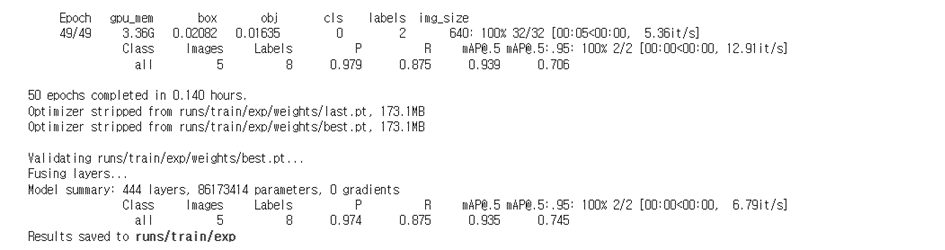 학습이 완료된 모습이다. mAP값이 0.935로 좋은 성능을 보여준다. 이렇게 학습을 마치면 /yolov5/runs /train 경로에 exp*디렉토리가 생성되는데, 이 폴더에서 여러 학습에 대한 진행 상황과 결과를 확인할 수 있다.