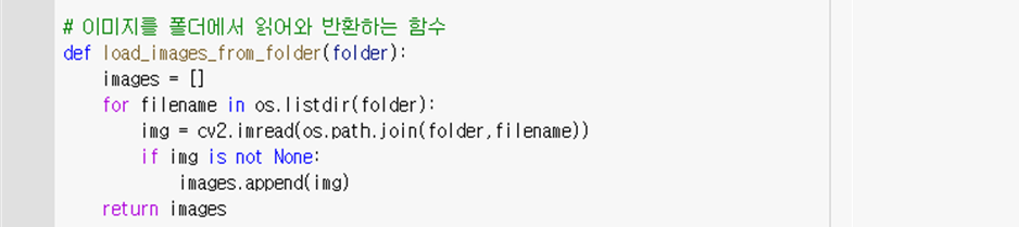 - Load_images_from_folder( ) : 폴더명을 받아 해당 폴더의 모든 이미지들을 읽어 리스트로 반환한다.