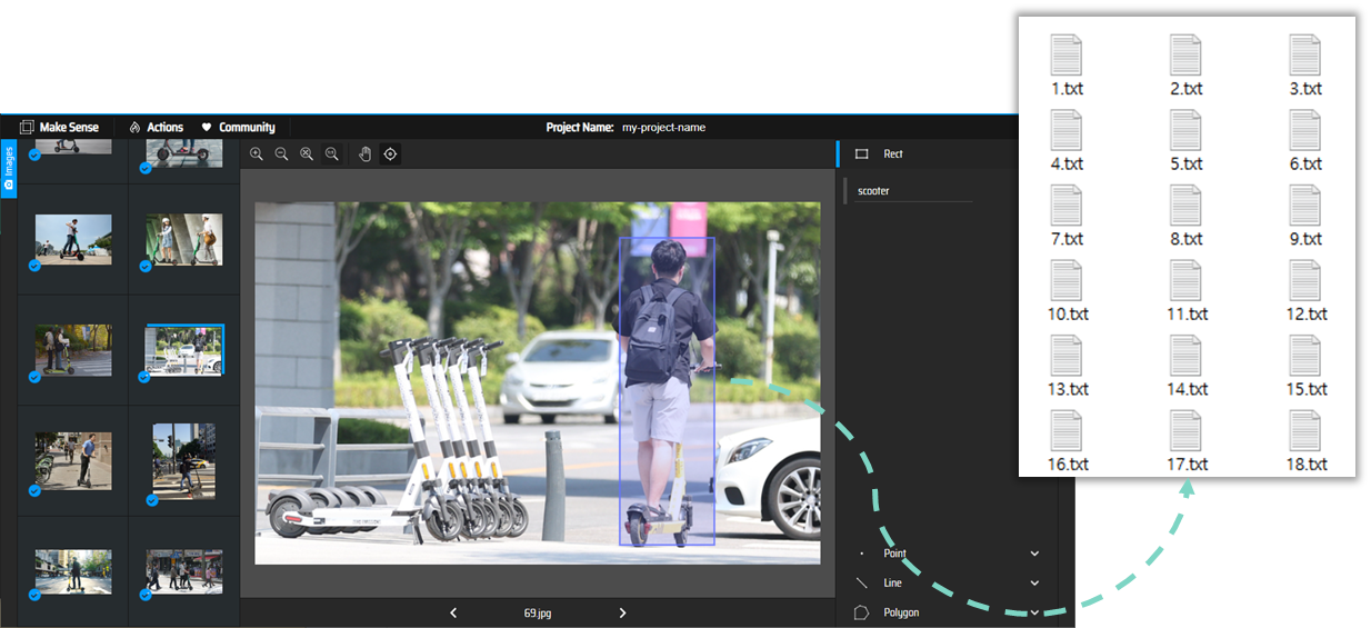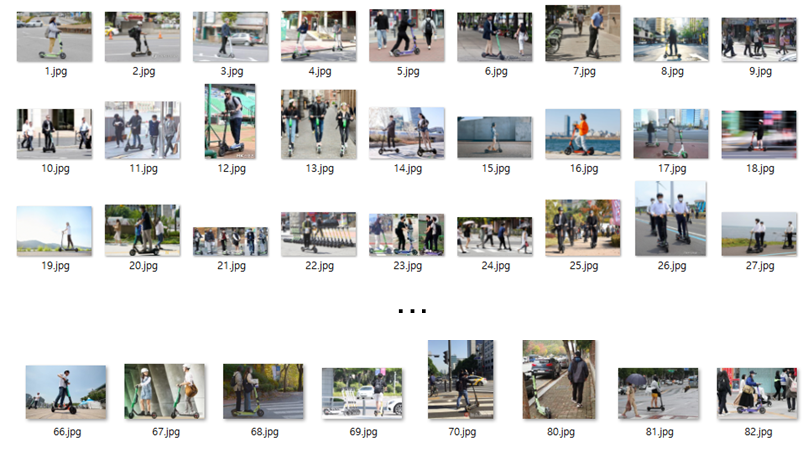 하지만 탑승자 + 킥보드를 객체영역으로 설정하니 보행자 까지 탑승자로 인식하는 문제가 발생하였다. 후에 보행자를 분리하여 인식시키기 위해 데이터를 추가 및 변경하였고 최종적으로 훈련데이터 셋 총77개, 테스트(검증) 데이터 셋, 11개로 학습을 진행하였다. (이미지의 파일명과 데이터 개수는 관계가 없다)