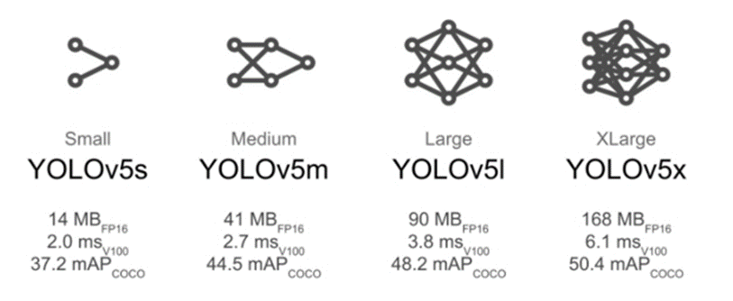 - weights : 모델 구조를 지정한다. YOLOv5는 다양한 모델 구조를 제공한다. 가장 간단한 모델은 YOLOv5s이며, 이외에도 YOLOv5m, YOLOv5l, YOLOv5x가 있다. (오른쪽으로 갈수록 구조가 복잡해지며, FPS가 낮아진다.)