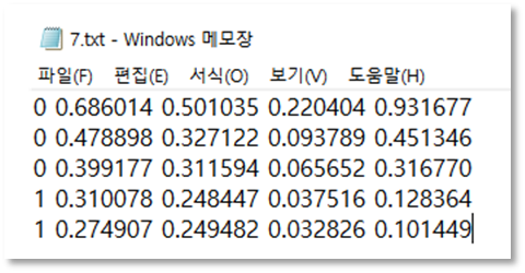 아래는 실제 7.txt의 내용이다. 첫번째 줄을 해석해 보면 클래스 0, 전동킥보드 객체이며, 그리드에서 바운딩 박스의 x 좌표는 0.686014, y좌표는 0.501035, 너비는 0.220404, 높이는 0.931677가 된다. 이렇게 탑승자 3, 보행자 2로 5개의 객체가 해당 사진에 있는 것을 확인할 수 있다.