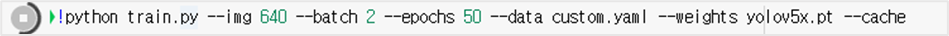YOLOv5와 데이터 셋이 준비되었다면, 이제 학습을 진행한다. YOLOv5는 학습에 python train.py를 사용한다. 이에 정의된 여러 파라미터를 지정해 학습을 진행할 수 있다.