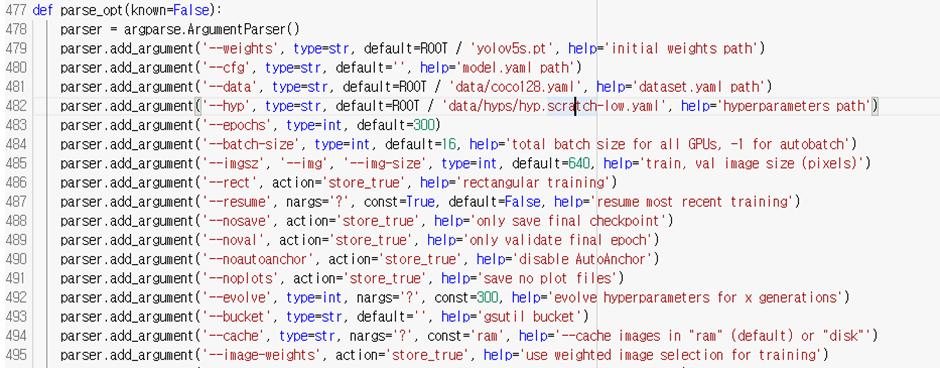 - img : 이미지의 크기를 지정한다. YOLOv5는 학습할 때 모든 이미지 사이즈를 동일하게 resizing 하기 때문에 별도의 이미지 처리가 필요하지 않다. 단, 검증시 같은 이미지 크기를 지정해야 일정한 성능이 나온다. 디폴트 값은 640이다.