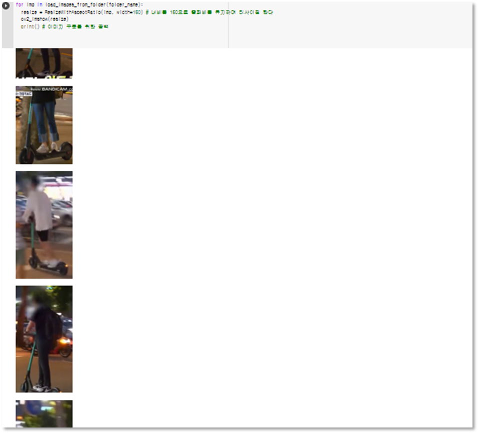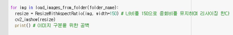 그리고 반복문을 통해 위 함수들을 호출하고 폴더에 저장된 이미지들을 읽어 리사이징후 출력하도록 한다.