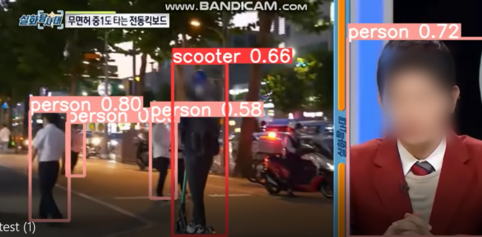 이제 학습한 모델을 이용해 테스트 영상에 적용해본다. 테스트 영상은 유튜브에서 추출하였으며, 여러 보행자와 전동 킥보드 탑승자가 등장한다.