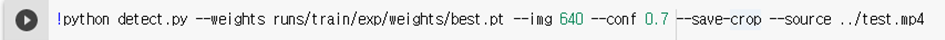 - weight : 학습한 모델의 weight를 넣어준다. 학습이 끝나면 exp폴더에 weight가 저장된다. 그 중 성능이 가장 좋은 것이 best.pt이다.
