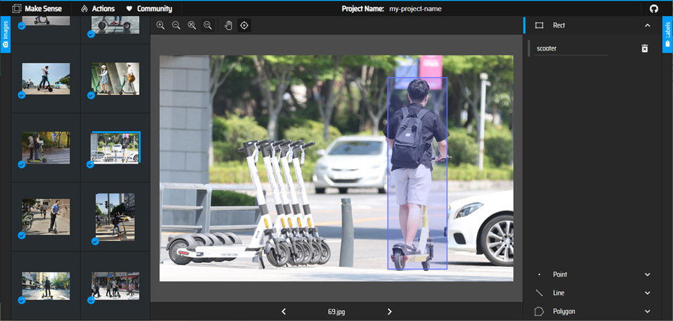 위 수집한 이미지에 대한 바운딩 박스 데이터를 라벨링하기 위해 사이트 https://www.makesense.ai/ 를 이용하였다. 웹사이트라 접근이 쉽고, 별도의 가입없이 사용이 가능하다. 자바 스크립트로 작성되어 속도도 굉장히 빠르며 yolo 형식의 라벨링을 지원한다.
