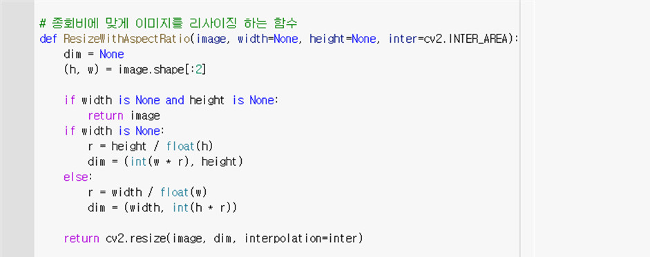 - ResizeWithAspectRatio( ) : 이미지가 너무 크게 출력될 시 확인이 어렵기 때문에 이미지를 리사이징한다. 너비를 인수로 받아 너비를 고정하고 비율을 유지하며 리사이징한 이미지를 반환한다.