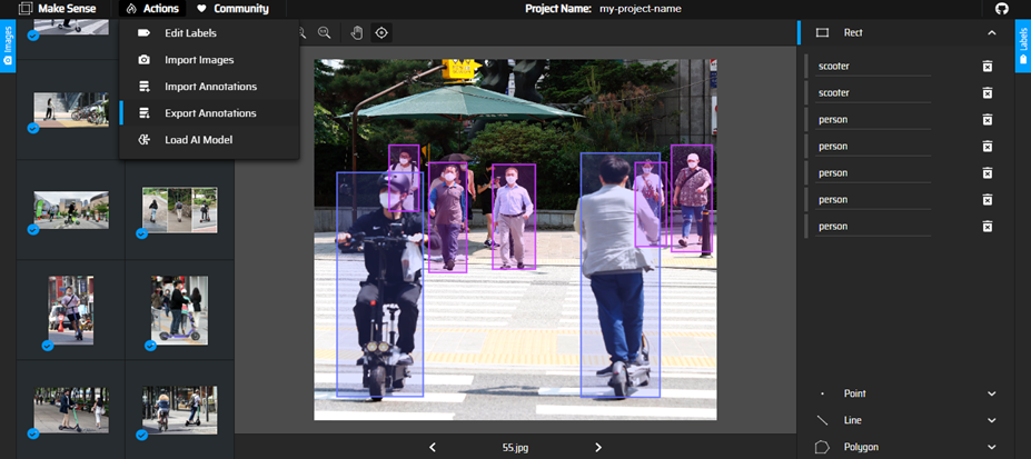 그리고 인식하고자 하는 모든 객체들에 대해 바운딩 박스를 그려주고 클래스를 지정해준다. 모든 이미지에 대한 레이블 처리가 끝났다면 Action ExportAnnotions A .zip package containing files in YOLO format.를 선택해 YOLO 형식으로 저장한다.