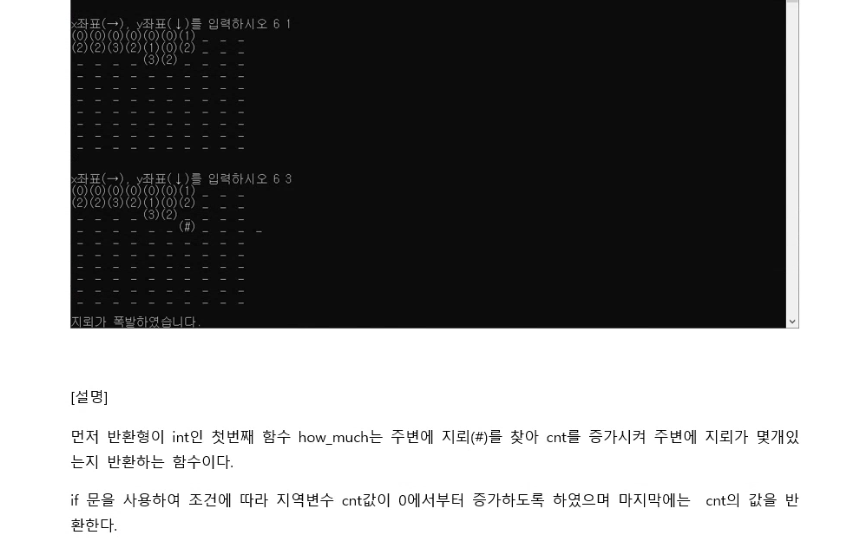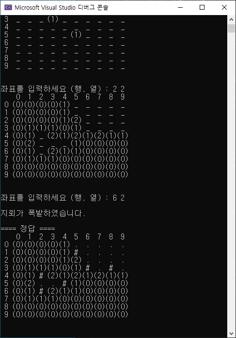 게임이 시작되면 먼저 scanf_s를 이용해 사용자로부터 행과 열로 이루어진 좌표를 입력받습니다. 해당 좌표값 따라 게임이 진행됩니다. 만약 지뢰가 있는 좌표 라면 '지뢰가 폭발하였습니다.'라는 문구와 함께 while 문을 빠져나가며(break) 게임이 종료됩니다. 지뢰가 아니라면 해당 좌표의 범위를 검사하기 위해 search 함수가 호출하고 갱신된 보드를 화면에 출력합니다. 보드는 다시 check_win 함수를 통해 검사 되고 승리했다면 if 문이 실행되면서 '!! 성공 !!'을 출력하고 무한루프가 종료됩니다. 마지막으로 print_answer 함수로 정답이 출력되며 게임의 결과를 확인할 수 있습니다.